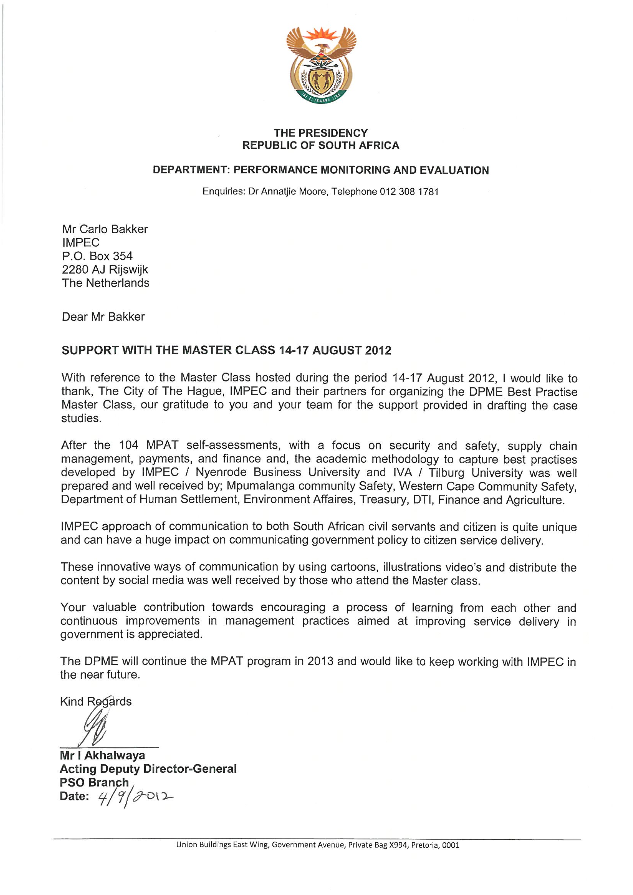 In this 3-day Master Class, IMPEC trained 70 moderators from national and provincial government departments to lead internal improvement initiatives. The focus is on strengthening the use of monitoring, evaluation, and knowledge exchange as tools for improved governance.